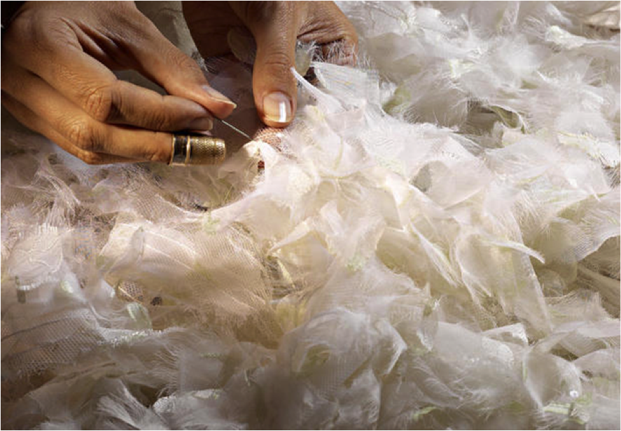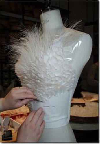 La Maison Lemarié est la seule maison spécialisée dans la broderie de plumes qui reste en France, dans le respect de l’environnement. La maison reçoit des plumes de partout d’une manière strictement contrôlée qui à l’arrivée seront traitées et teintes.
