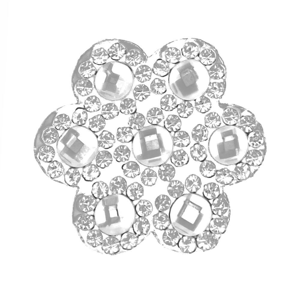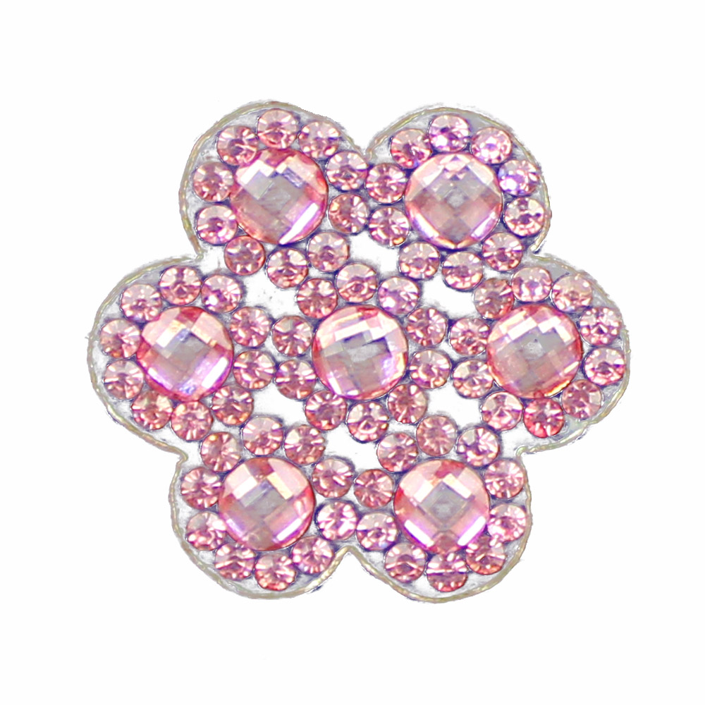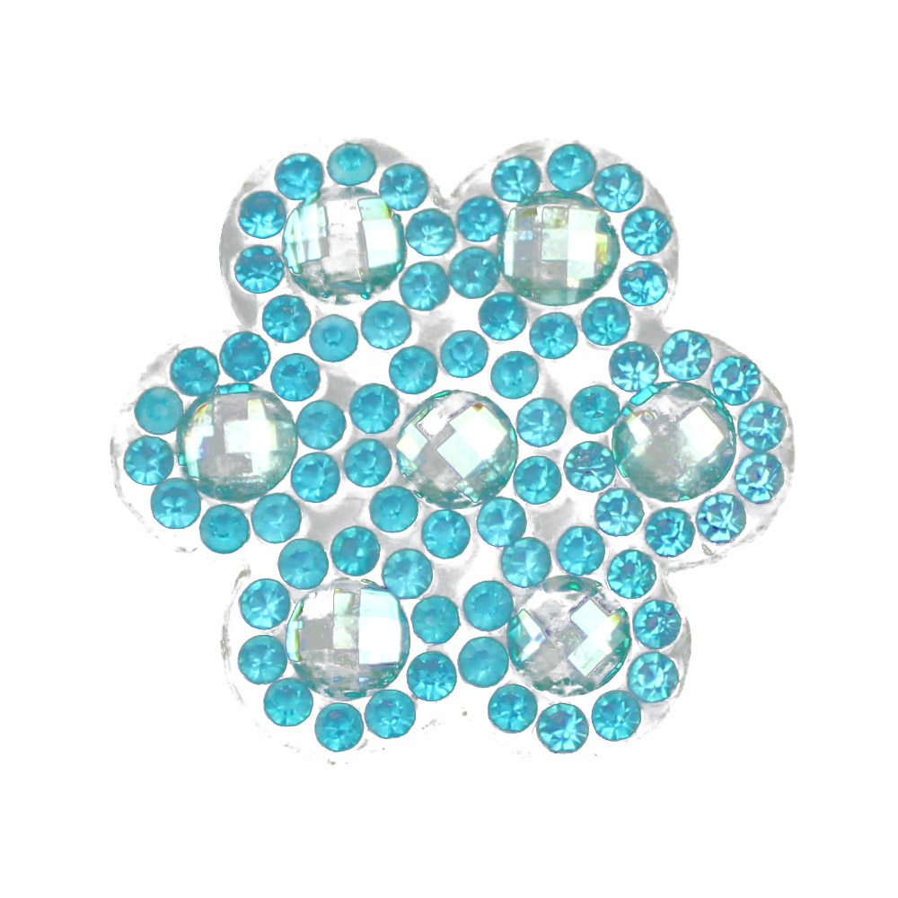 Aplicación de termoadhesivo de 3×3 cm con pedrería y 7 acrílicos circulares de 6 mm de diámetro cada uno.