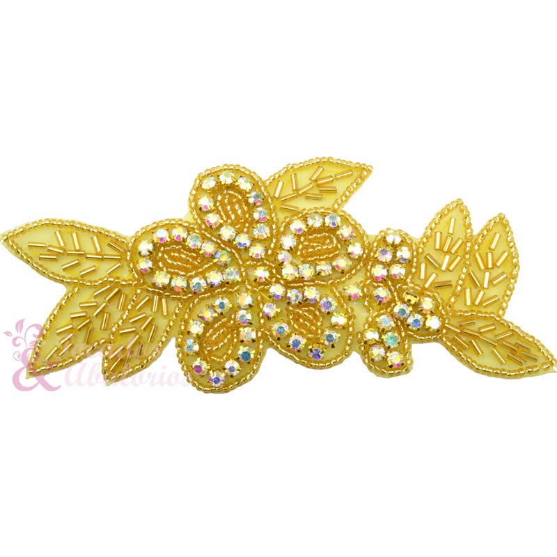 Aplicación termoadhesiva de 14.5×5.5cm. realizada con tupi y strass.