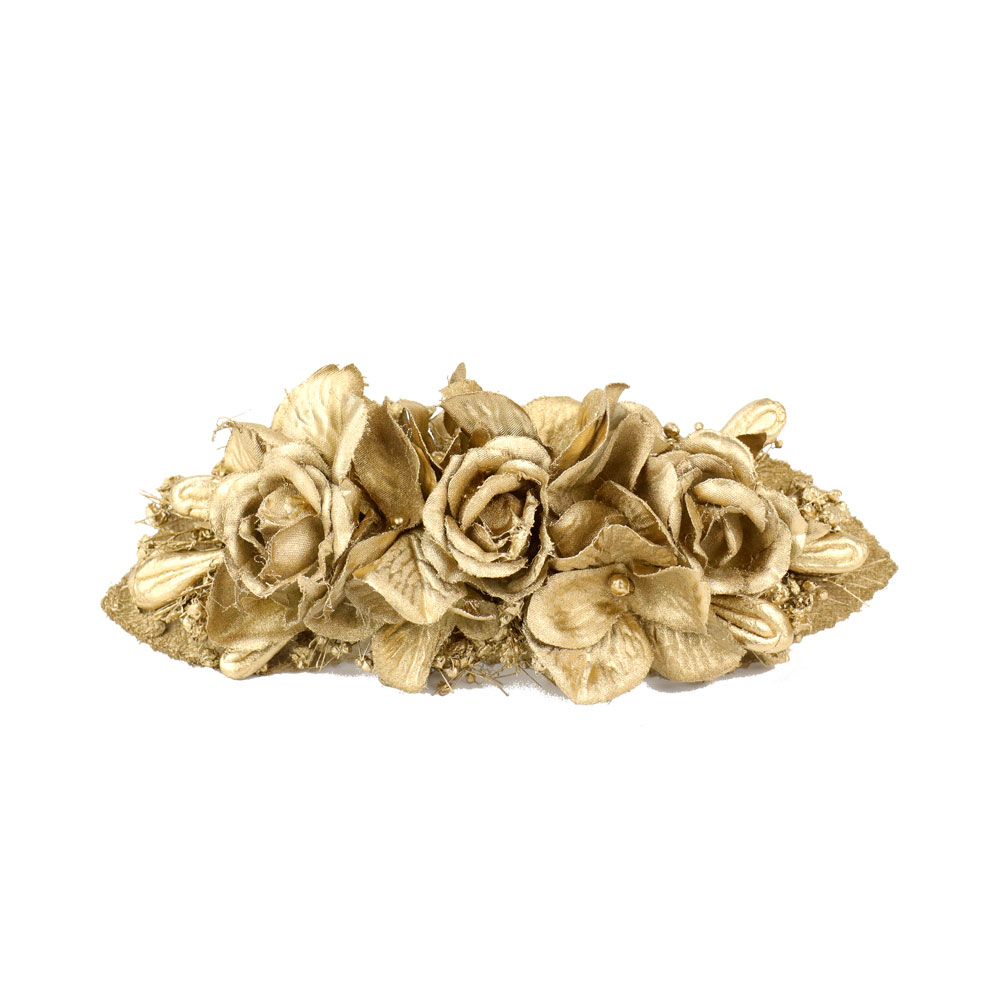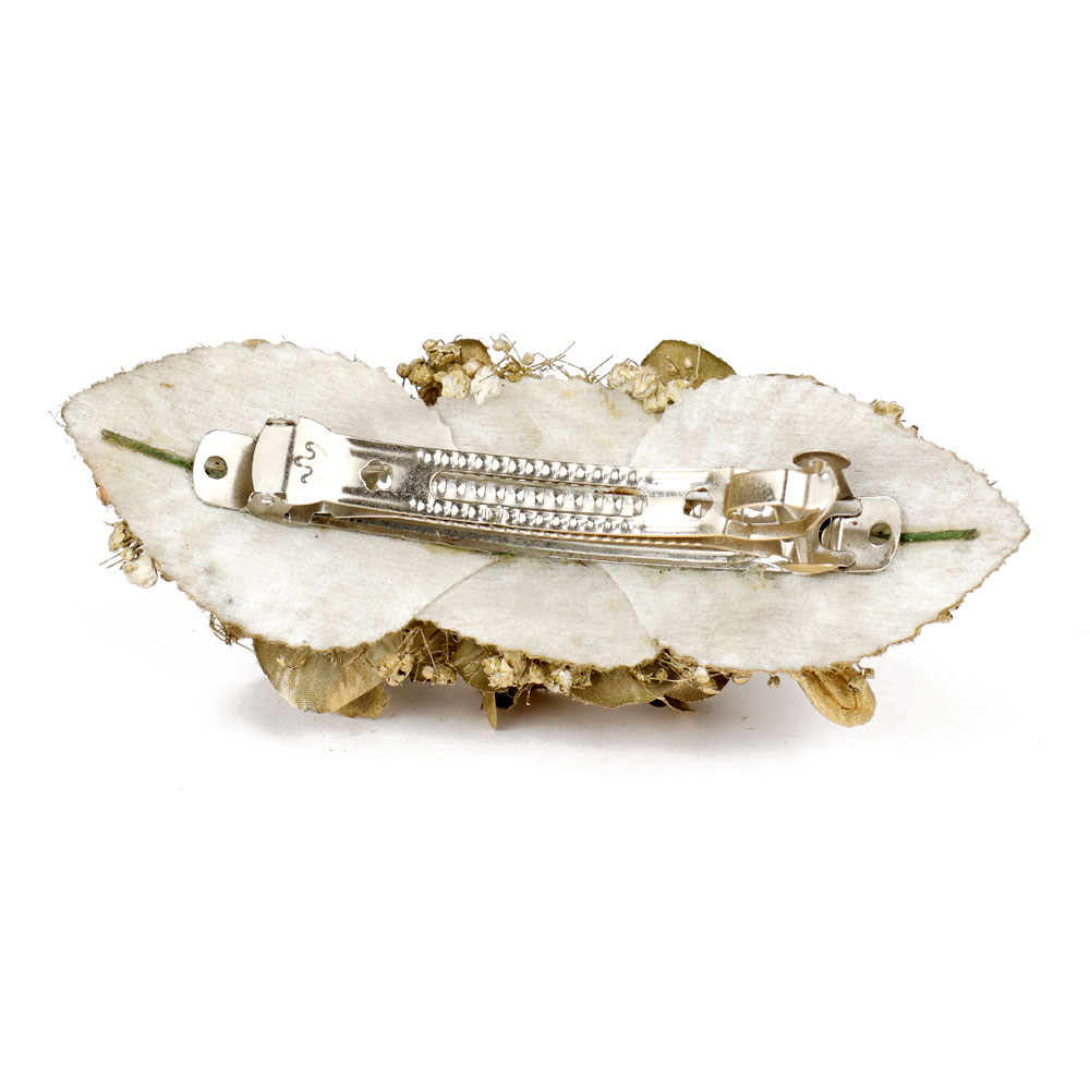 Barrette de roses en tissu, gypsophile, feuilles en feutrine et pistils. Mesure 14x06cm. Barrette pour fixation comprise. Parfaite pour Première Communion, bibis ou pour fixer le voile de mariée.