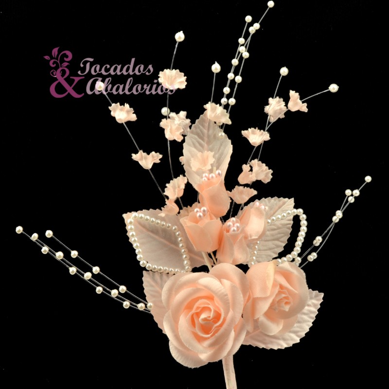 Bouquet en tissu composé de 4 petites fleurs et plusieurs fleurs d’entre 03cm et 04cm, ainsi que de feuilles décorées avec des antennes à clochettes et petites perles. Mesure 20x12cm.