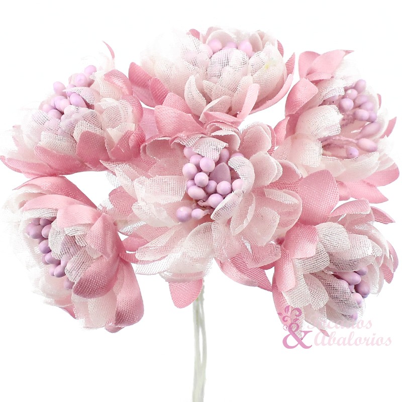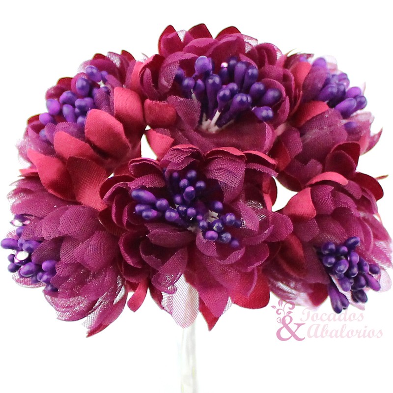 Bouquet de 6 nénuphars en tissu de 3,5cm de diamètre chacun avec pistils bicolore et tige en fil de fer individuel, très facile à modeler.