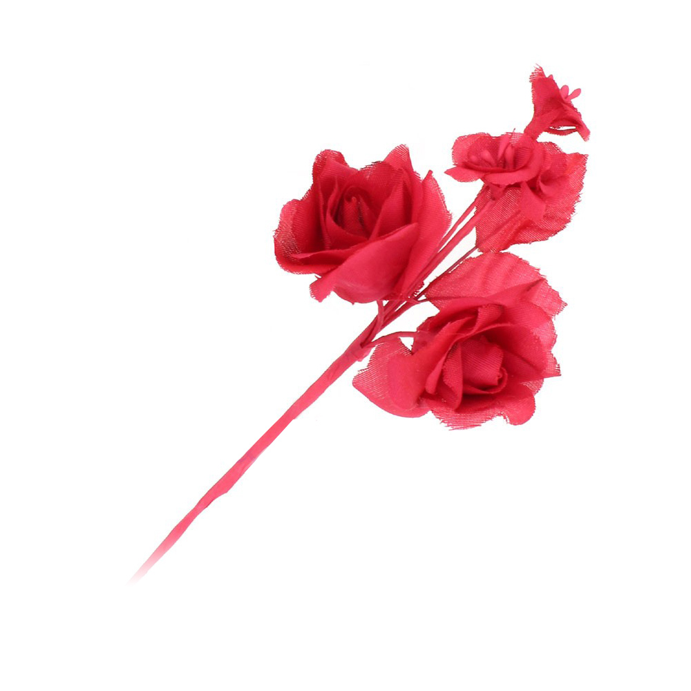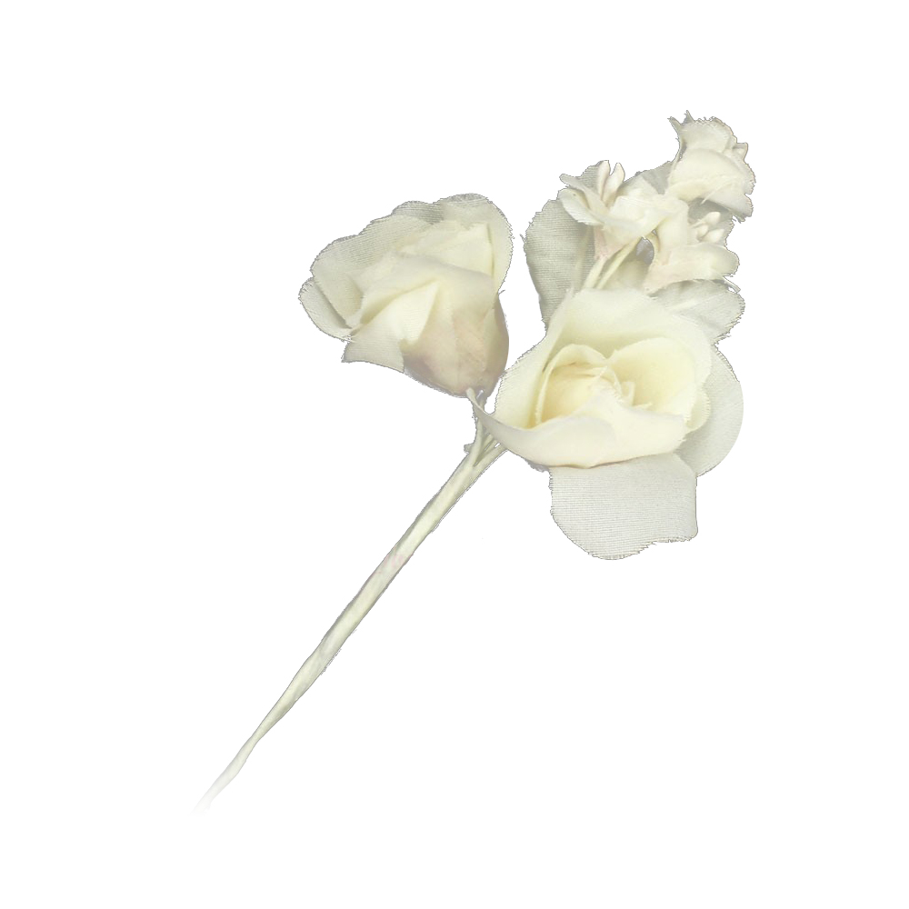 Bouquet en tissu composé de 3 petites fleurs avec pistils et 2 fleurs d’environ 04cm, ainsi que de 3 feuilles de 03x02cm et tige de 17cm. Mesure 07x07cm.