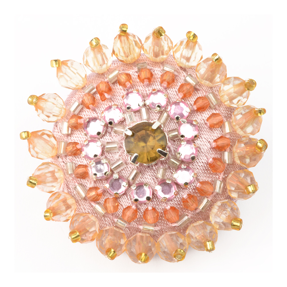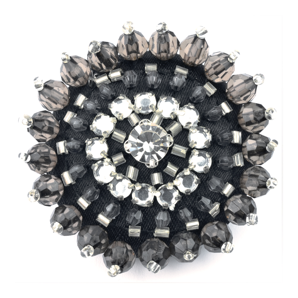 Bouton modèle tournesol en rocaille et pierres incrustées d’un diamètre de 48 millimètres.
