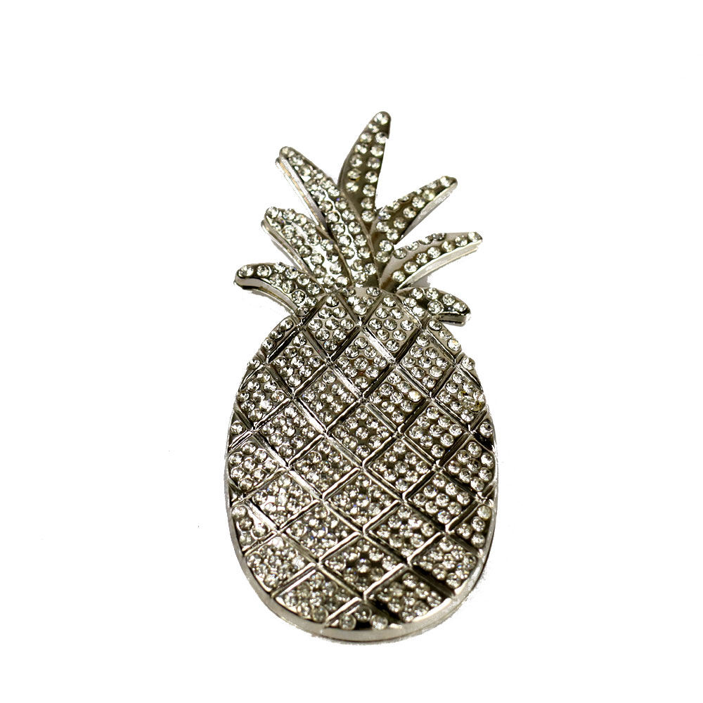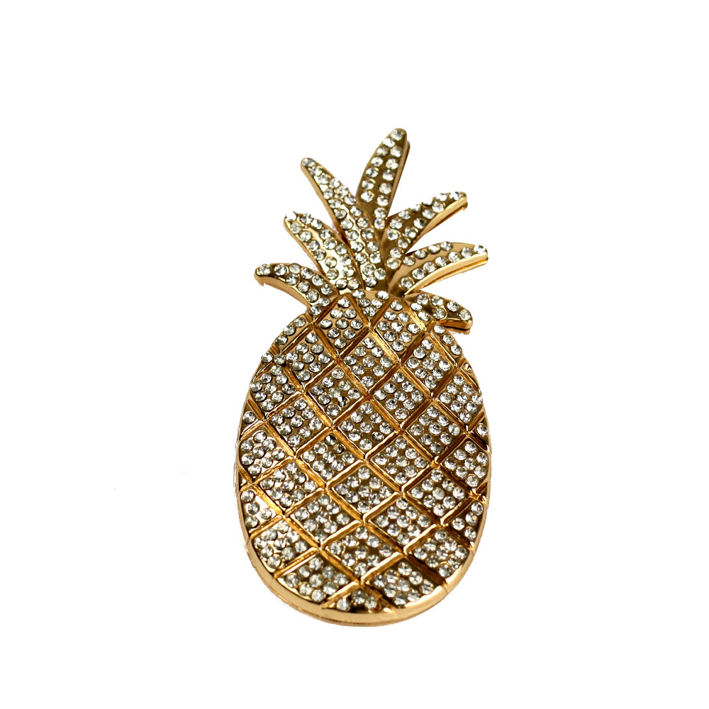 Broche en métal en forme d’ananas recouverte de zircons type strass. Il dispose d’un aimant arrière pour ne pas avoir à percer le vêtement. Mesures extérieures 7,5×3,5cm.