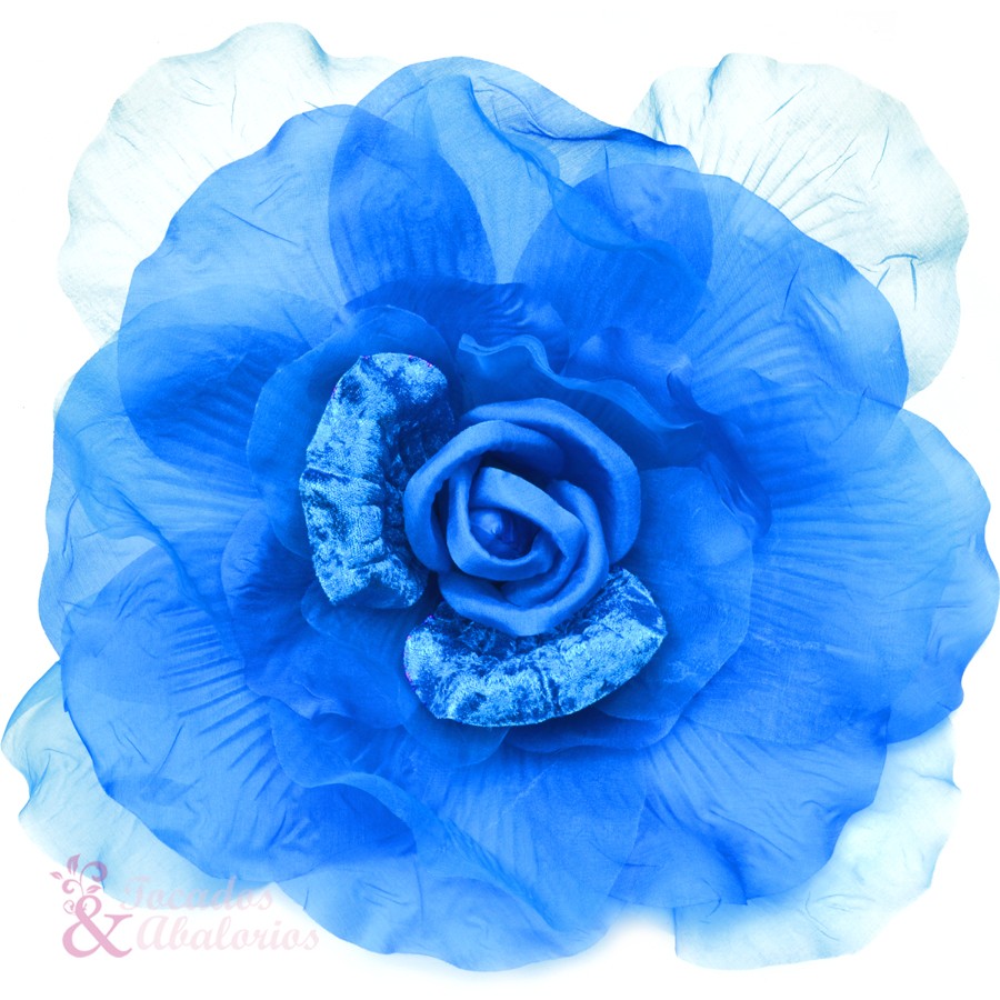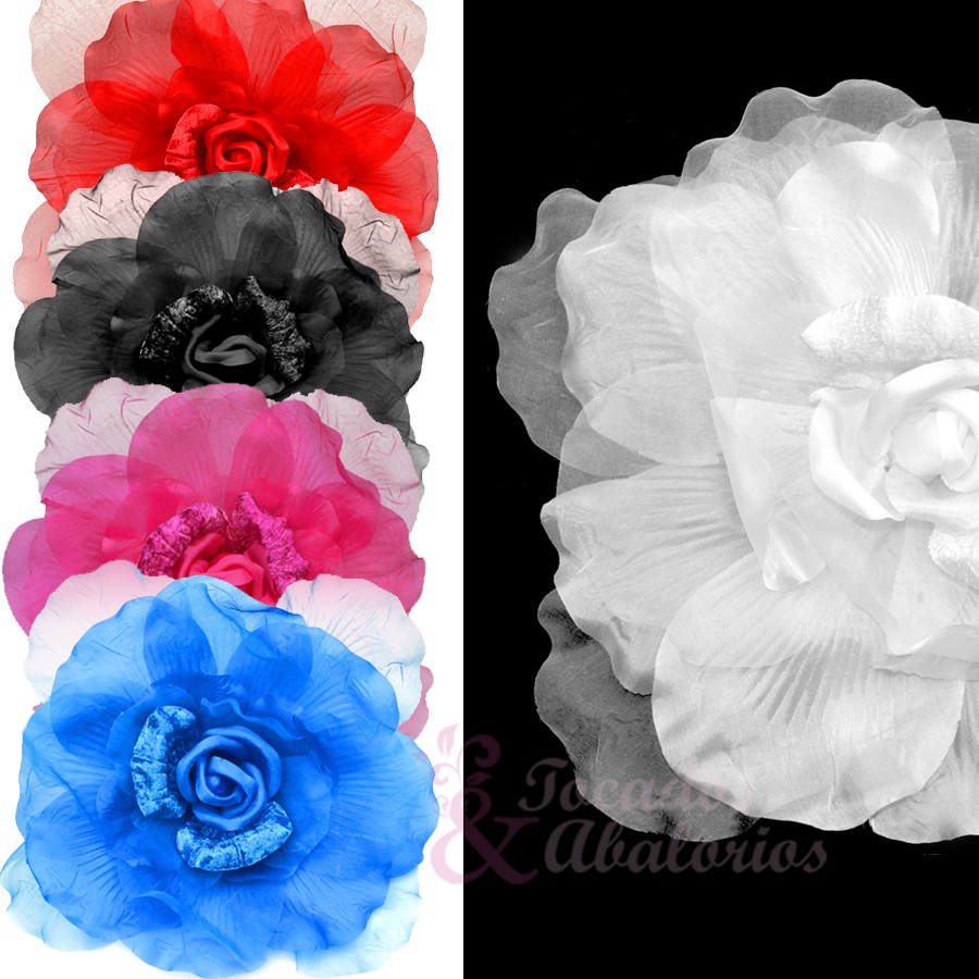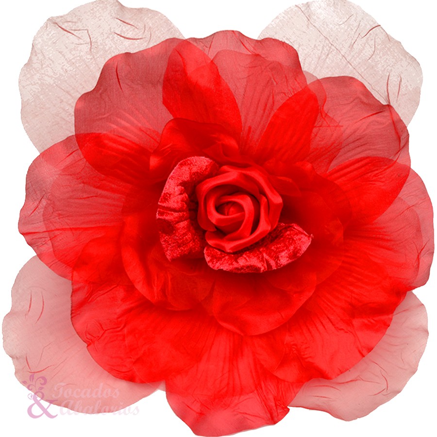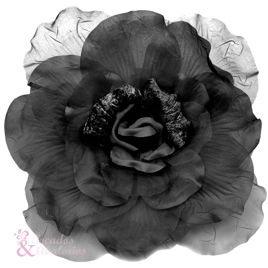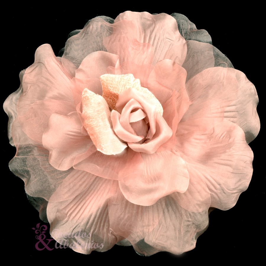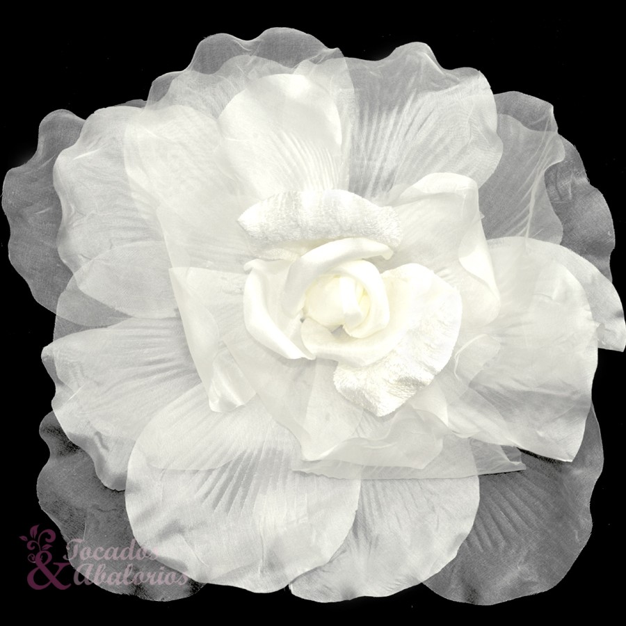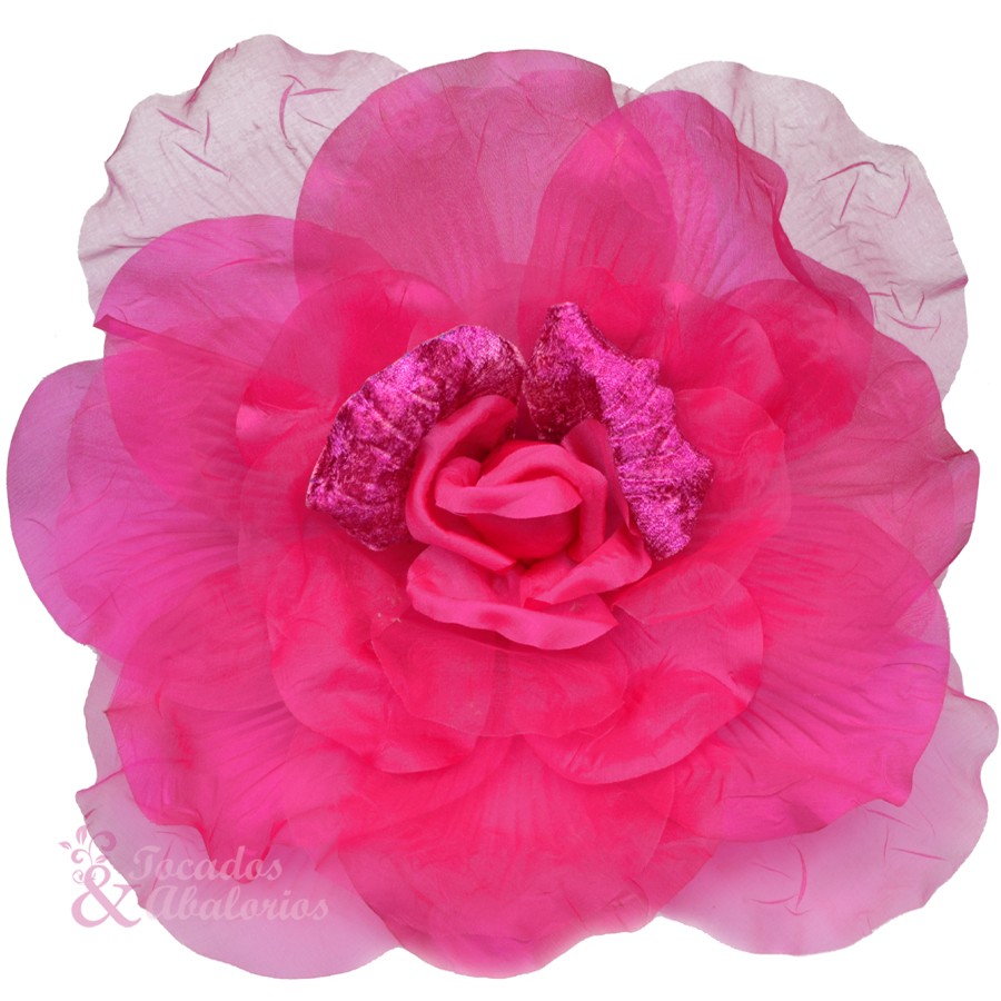 Fleur en organza et velours XXL. Mesure 30cm. Élaborée à la main, elle peut avoir des traces d’adhésif au revers.