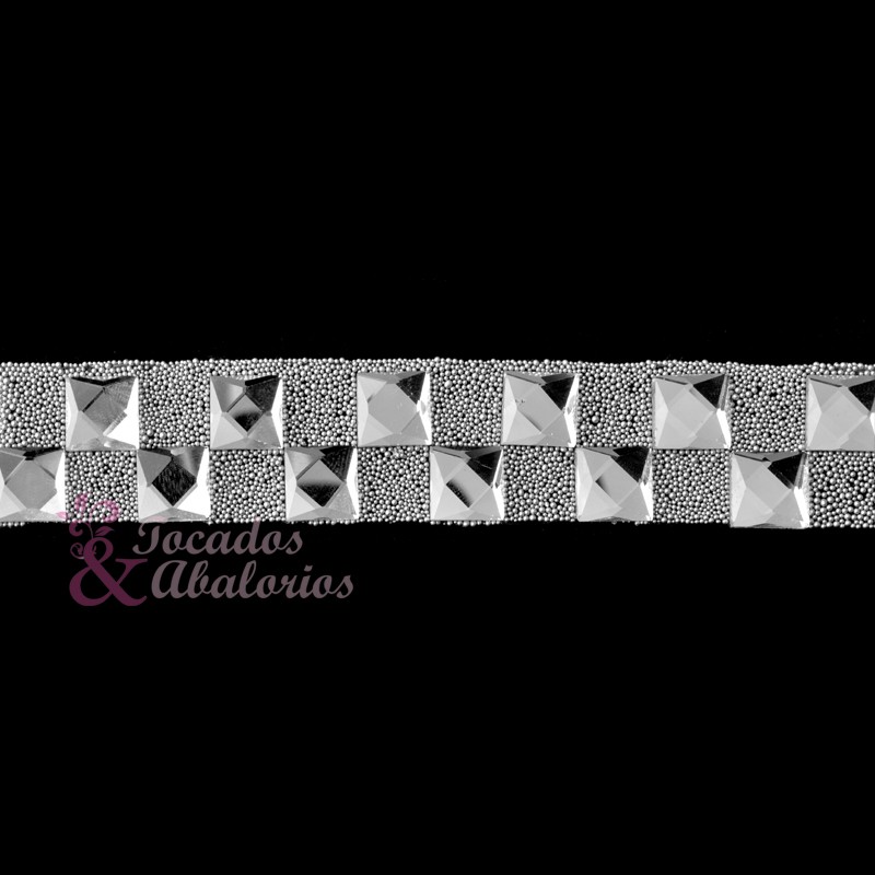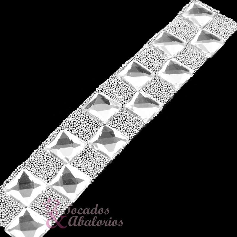 Cristal transparente de 1×1 cm. colocado en zigzag sobre mostacilla, en una plancha termoadhesiva de 12×2 cm. que le facilitará su colocación en cualquier tejido. Estas piezas se pueden recortar facilmente y dejar en piezas individuales.