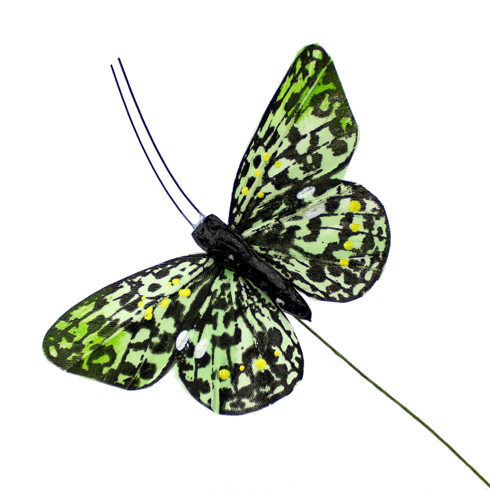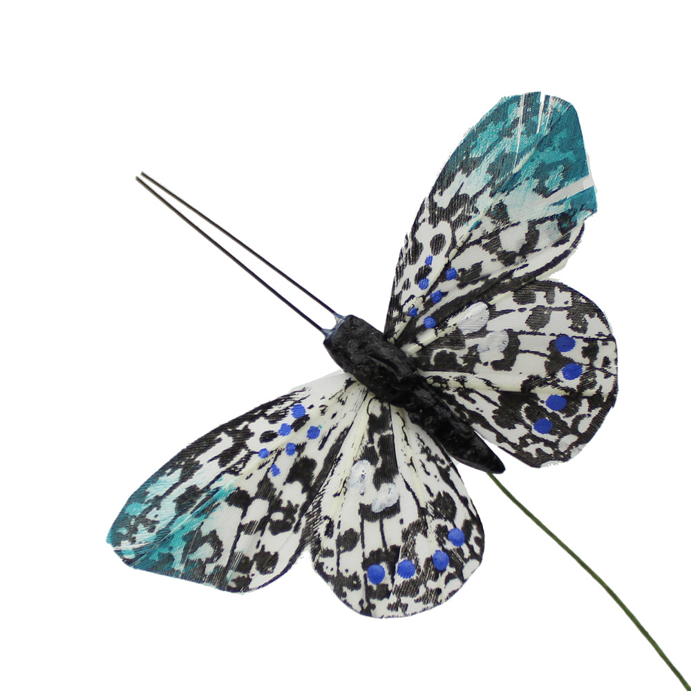 Papillon aux ailes en plumes peintes à la main. Mesure 8×4 cm.