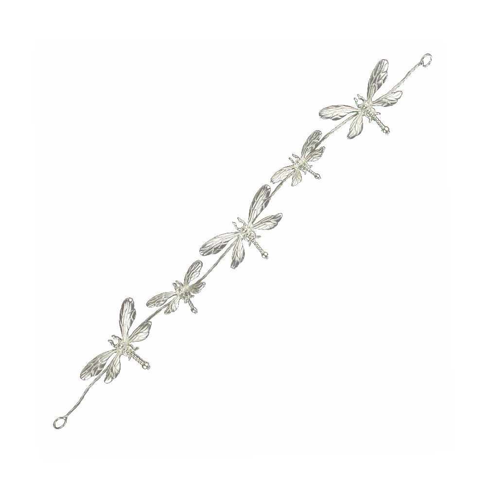 Tiare à libellules en laiton sur fil de fer tressé. Les libellules mesurent entre 05x03cm et 04x02cm. Mesure 28cm de long. Épingles pour fixation comprises.
