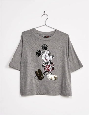 Le look suivant est une combinaison Disney avec ce t-shirt à sequins réversibles de Berhka, que vous pouvez porter à notre plus célèbre ami de la maison Micky en couleur ou totalement en noir.