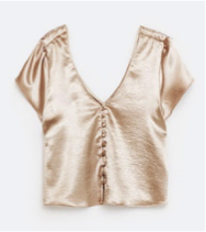 Le premier look que l’on a misé sur un jean super skinny noir de chez Brershka avec un top en satin à manches courtes, couleur champagne avec un décolleté en V et plein de petits boutons.
